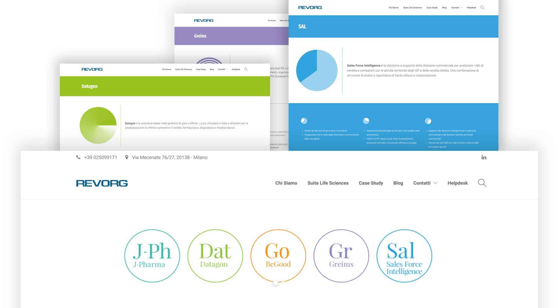 Il focus si sposta dal nome dell’azienda a quello delle singole soluzioni della suite Revorg, che acquisiscono più autorevolezza e organicità visiva. La nuova identità presenta la completezza delle soluzioni per il life science in modo completamente differente utilizzando una veste grafica fuori dai classici stili dell’industria.